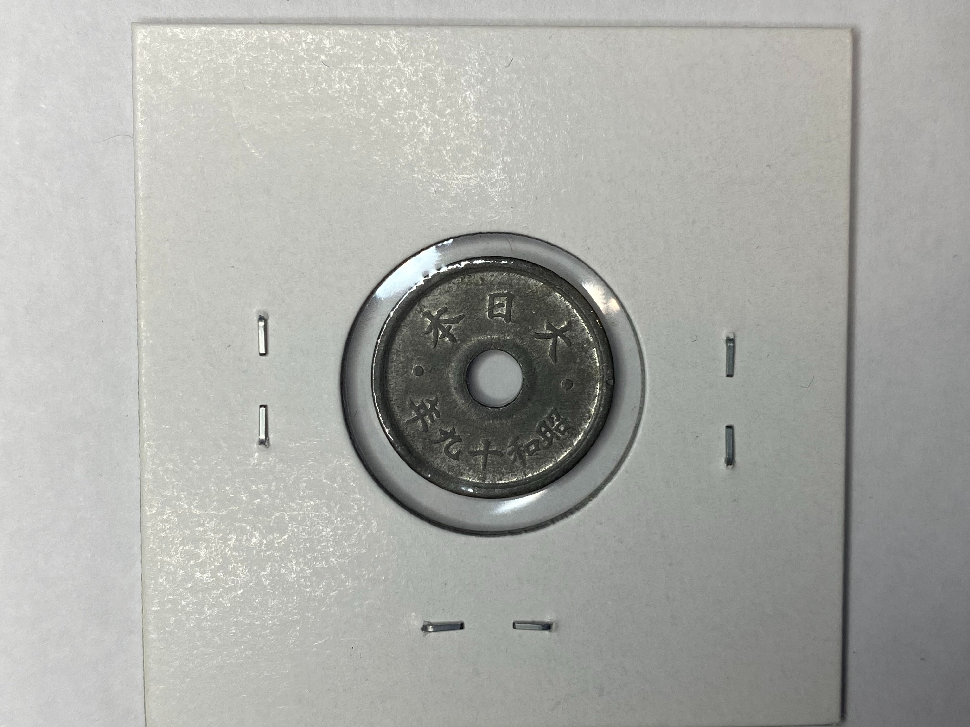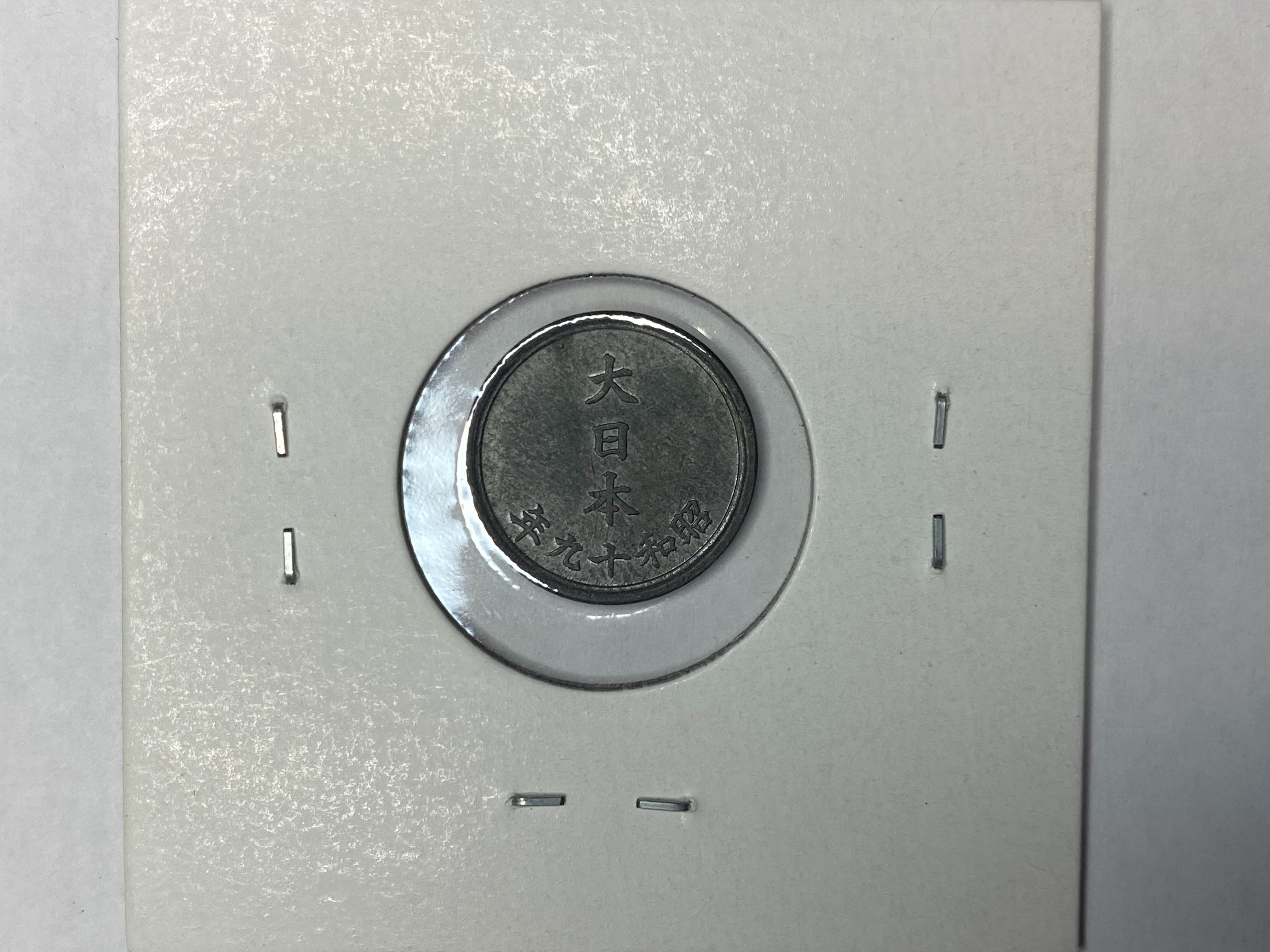 太平洋方面の戦局が悪化した昭和19年になると、兵器の製造が一層優先されたため、アルミを用いた貨幣が製造されなくなります。代わって登場したのは錫と亜鉛を合成した貨幣です。これは当時日本が占領していた東南アジアで産出されるものでしたが、柔らかすぎるため貨幣に適した素材ではありません。さらに南方の資源地帯からの輸送が困難になっていたため、5銭硬貨と10銭硬貨は昭和19年中に製造が中止されました。1銭硬貨は引き続き昭和20年まで製造が続きます。昭和20年には金属ですらないマグネサイトの硬貨も製造されましたが、こちらは流通することなく終戦となりました。
