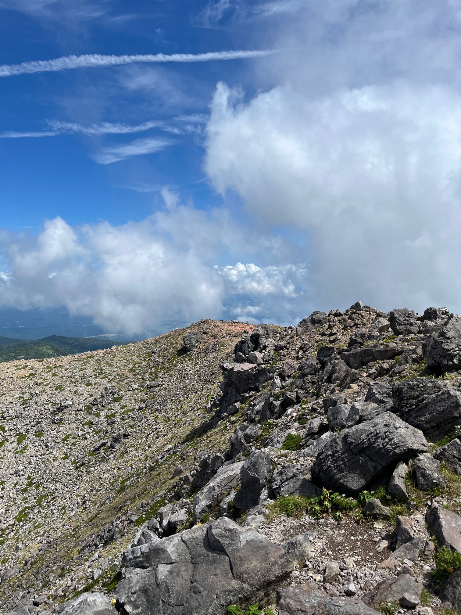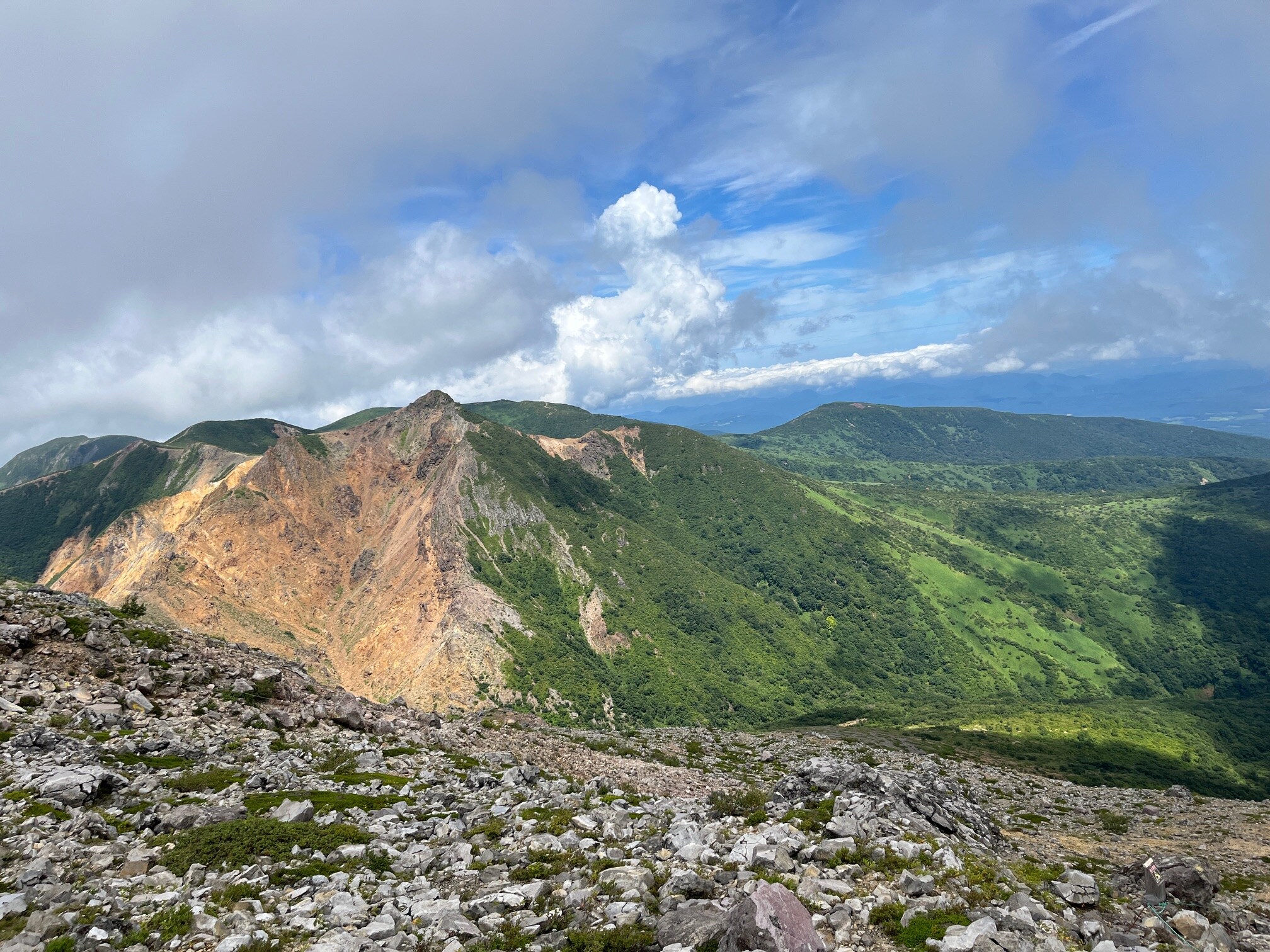 この日は登山です。約600年前の室町時代に噴火した茶臼岳ですが、ロープウェイに乗り、山頂駅からスタート。19度は陰ると少し肌寒く、晴れると気持ちがいい。