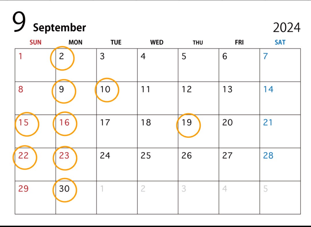 9月の定休日になります。