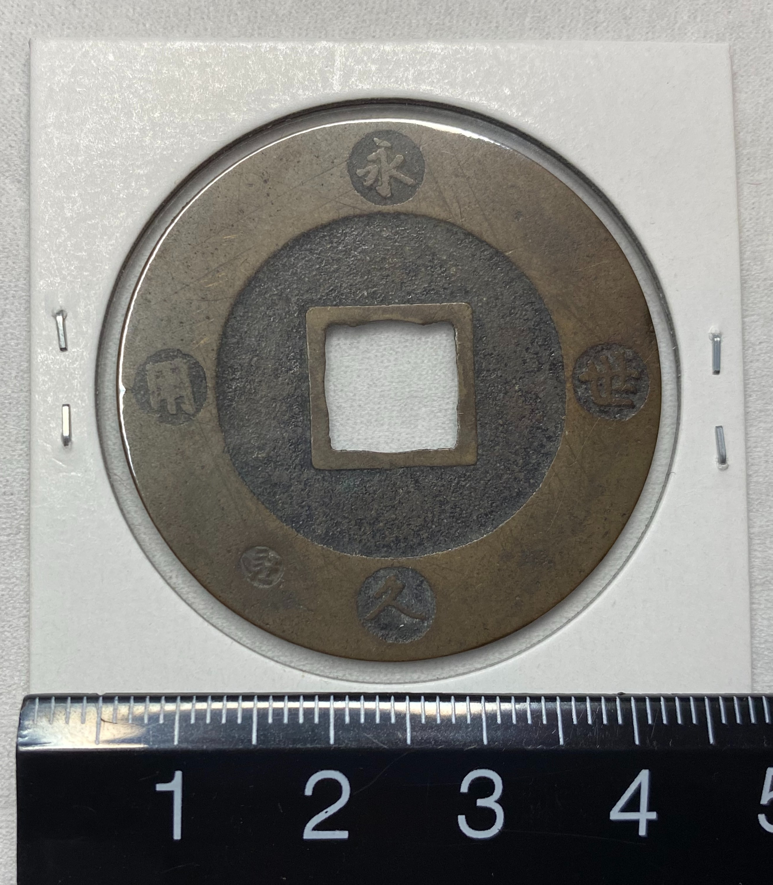 宝永通宝は、宝永5(1708)年、十文通用の大型銭として京都の七条で鋳造されました。背輪「永久世用」と打たれ、一箇所に小さく「珍」の字が入っています。当時の幕府は金銀の産出量が衰退した上に、地震や噴火といった自然災害が続いたことで財政が傾いていました。そのため、銭座からの一定額の上納金による利益を目的として鋳造されました。しかし、支払いや両替に不便だったことで庶民からは不評であり、鋳造の翌年の宝永6(1709)年に通用停止となりました。