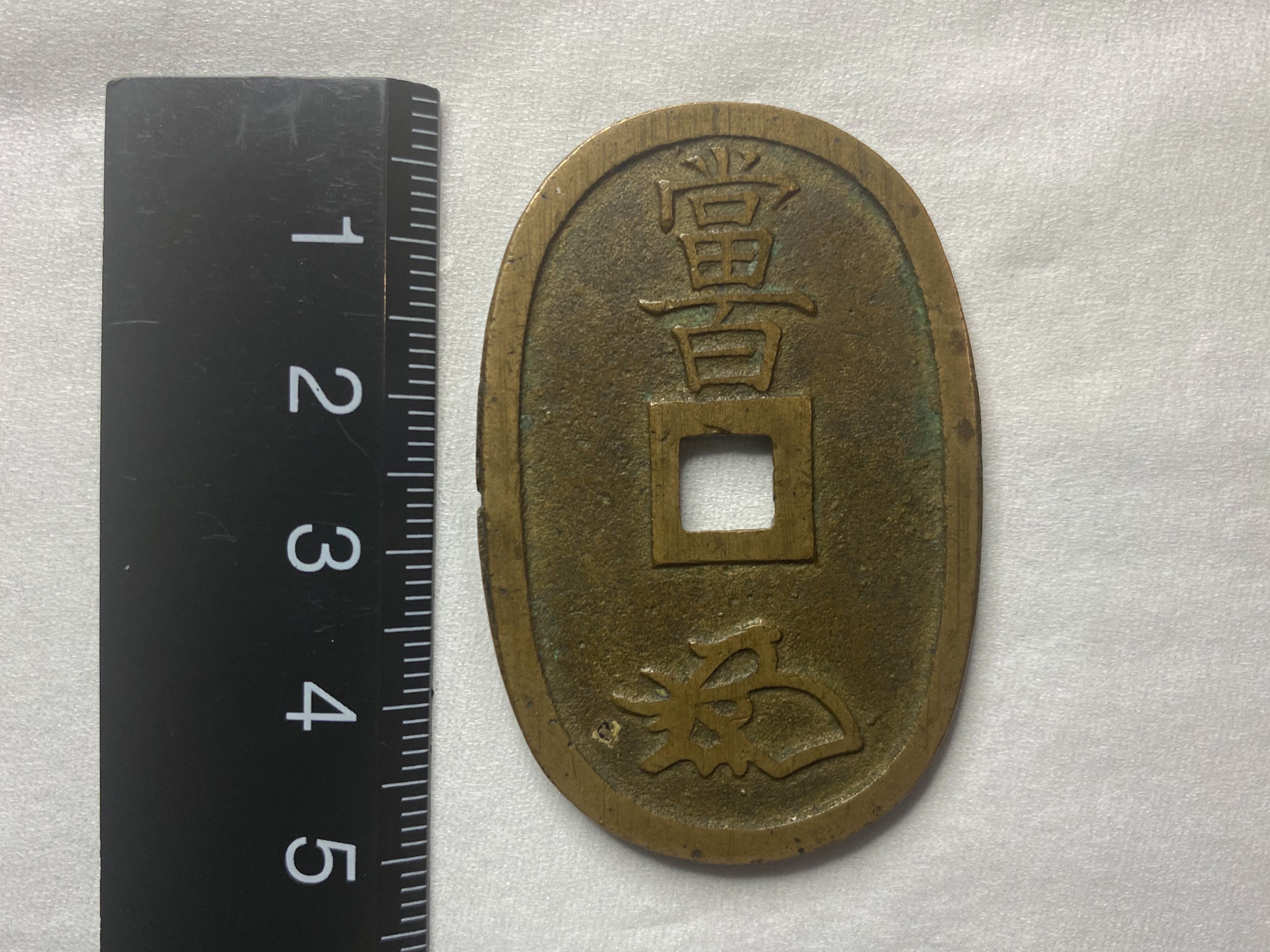 天保6(1835)年に鋳造が始まったのが天保通宝です。背面に「当百」とあるように、100文通用と定められました。小判型をしており、背面下部には小判と同様に金座後藤家の花押が鋳込まれています。