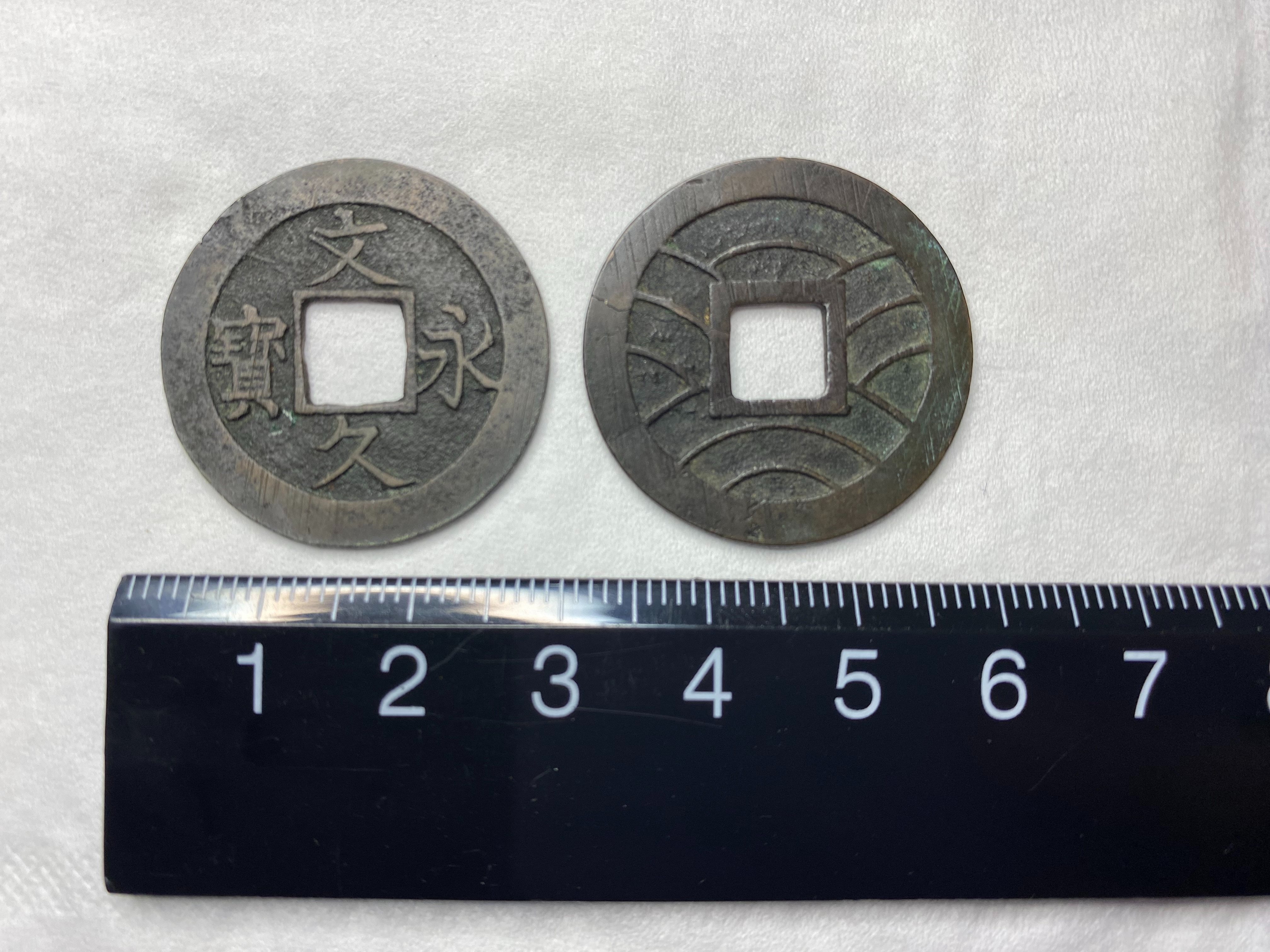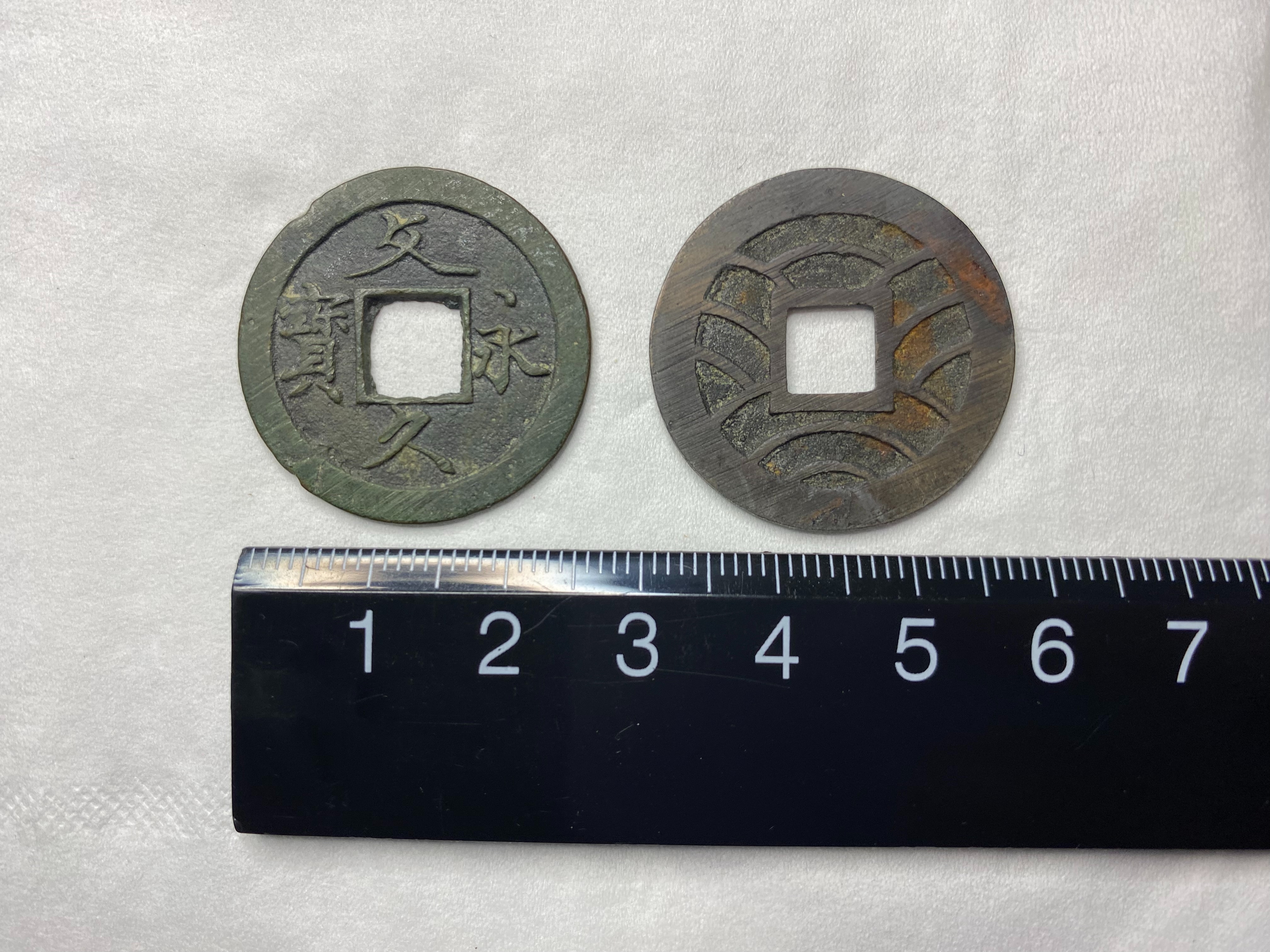 文久永宝は、文久2年に四文通用として制定、鋳造が開始されました。原材料である銅の値上がりに合わせ、寛永四文銭よりも軽量化されていました(4.5g→3.4g)。かつて寛永四文銭は銅で鋳造されていましたが、銅の大幅な値上がりによって材料が鉄に変更されました。しかし、鉄銭の評判はすこぶる悪く、ほとんど流通しませんでした。このような背景があったため、文久永宝では銅銭に立ち返ったものの、銅の高騰が続いていたため、軽量化という手段がとられました。