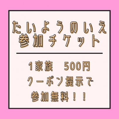 【たいようのいえ】にて開催されるおひるねアート撮影会、フォトブース撮影会にて使用できるクーポンです。 当日受付にご提示下さい。 クーポンを使用されない場合は1家族500円の参加費となります。