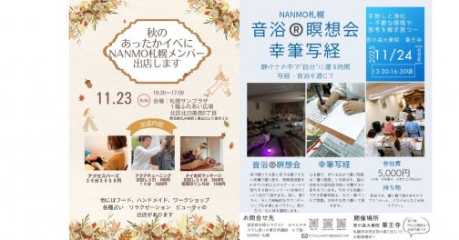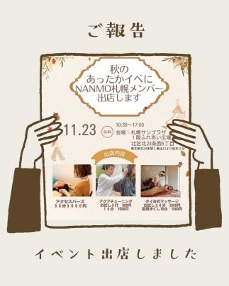 23日は北区のサンプラザ1Fふれあい広場で開催される「あったかイベ」にNANMO札幌の3人が出店します。アクセスバーズにタイ古式マッサージ、アクアチューニングです