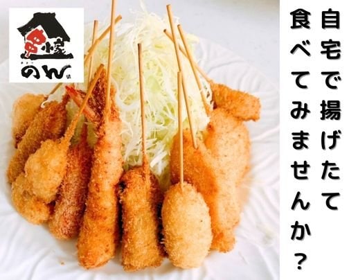 いつもよく伺う神戸新開地にある串小家のんでは、食材を揚げる前まで準備した状態でお送りいたします。自然解凍をしてから油でカラッと揚げたてを召し上がれます。ご自宅のフライヤーでも流行りのノンフライヤーでも調理可能です!!オーブンレンジもお勧めです!!