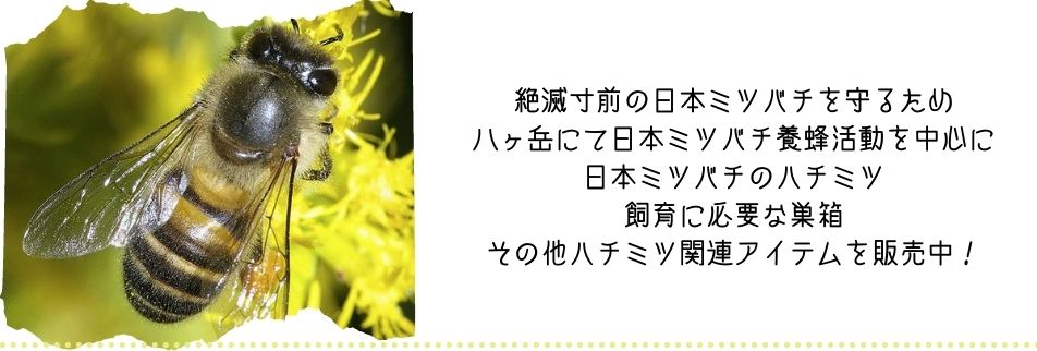 絶滅寸前の日本ミツバチを守るため、八ヶ岳にて日本ミツバチ養蜂活動を中心に、日本ミツバチのハチミツ、飼育に必要な巣箱、その他ハチミツ関連アイテム(ミツロウ、熊蜂の焼酎漬、蜂の子他)を販売中。