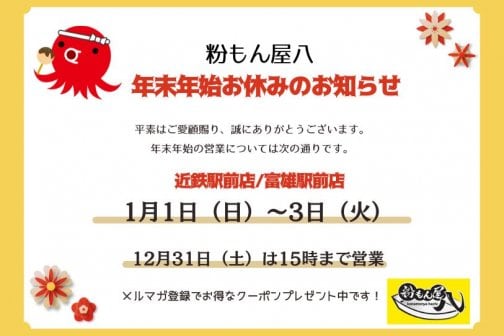 奈良B級グルメ優勝のたこ焼き!粉もん屋八(近鉄郡山駅前店/富雄駅前店)の年末年始営業についてのお知らせです。