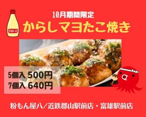 たこ焼き粉もん屋八の期間限定タコ焼きは、ほのかに香るからしの風味とほんの少しの辛味が味覚を刺激する「からしマヨたこ焼き」です! …続きを読む