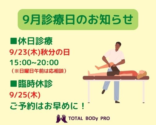 【9月臨時診療&臨時休診のお知らせ!】愛媛県松山市 TOTAL BODy PRO