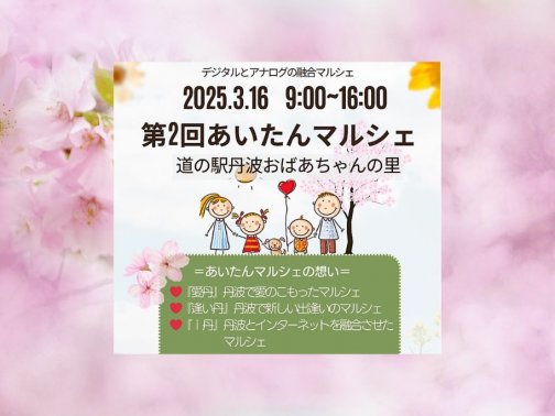 第二回あいたんマルシェが3月6日(日)に道の駅おばあちゃんの里にて開催されます。春を感じられる良い時期になってきました。おばあちゃんの里は道の駅の中でも大人気の道の駅です。丹波の名産や、地元で取れるお野菜や加工品、色んな物が揃っていて楽しいんです。このおばあちゃんの里でマルシェを開催されるので出店します。出店の中にも小さなお店が入ってるそんなイメージで色んな方の素敵な商品を出店します。春の丹波に是非遊びに来てください。 …続きを読む