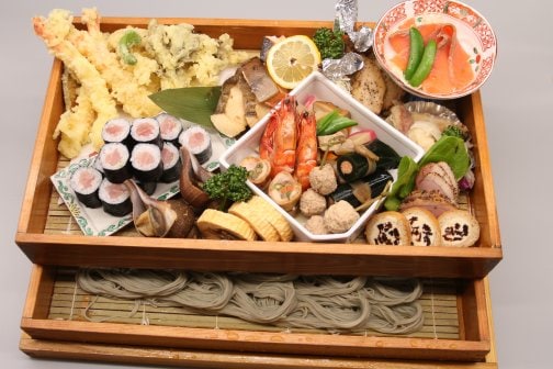 へぎそばと天ぷら入りオードブルの二段重ね。