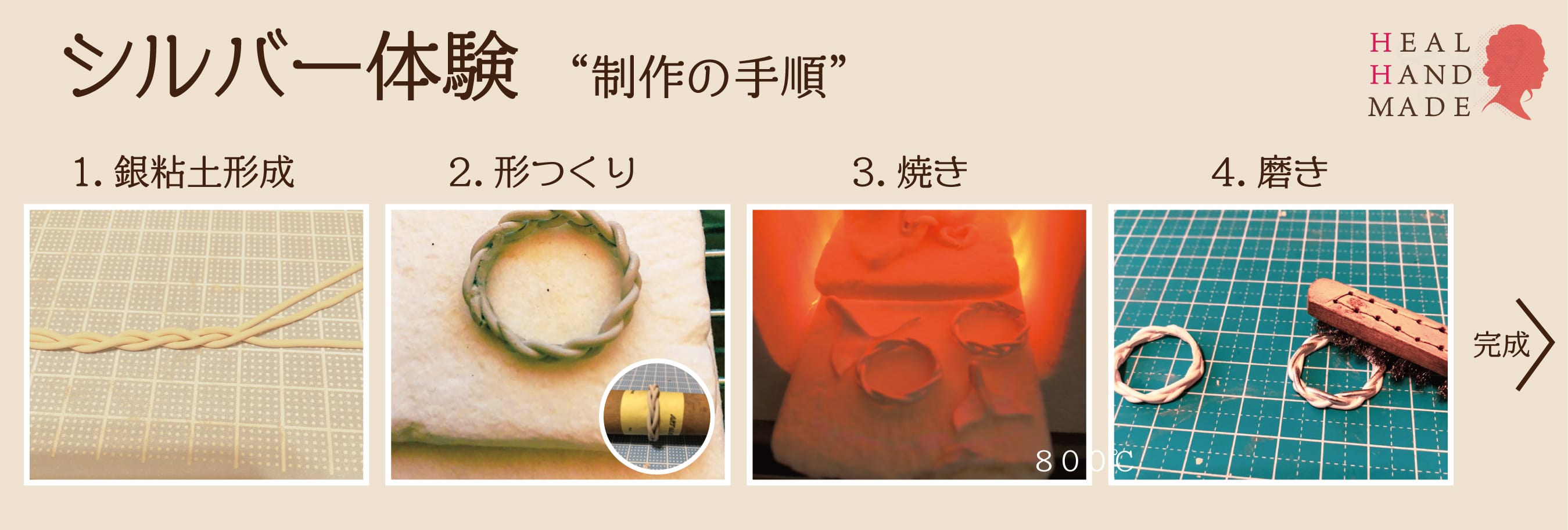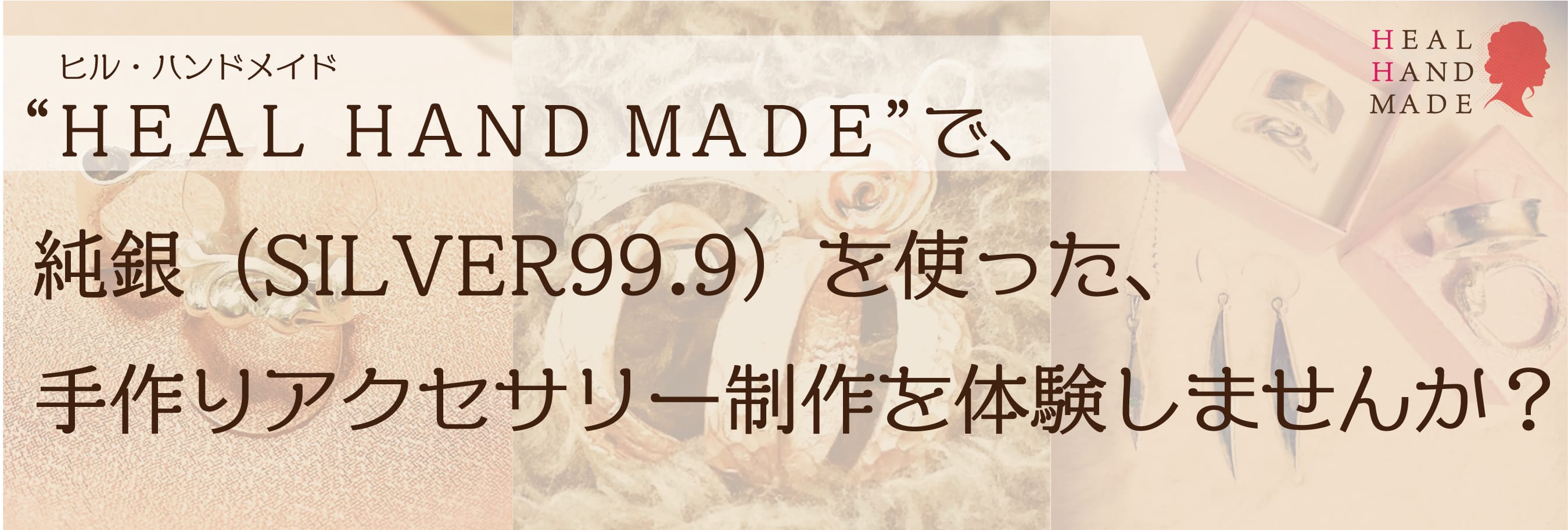 ”ヒール・ハンドメイド”は、埼玉県川口市を拠点に、心を癒すアートクレイシルバー作り体験を、生徒さまおひとりおひとりのペースに合わせて、お手伝いをいたします。指先で作るハンドメイドならではのあたたかみ、手触りを感じることができるシルバー教室は、当日制作した作品をお持ち帰りいただける体験となっております。お1人様はもちろん、女子会やカップルさん、お子様の工作体験など、グループでのご参加も大歓迎です。ご質問や不明点などございましたら、お気軽にお問い合わせ下さい。