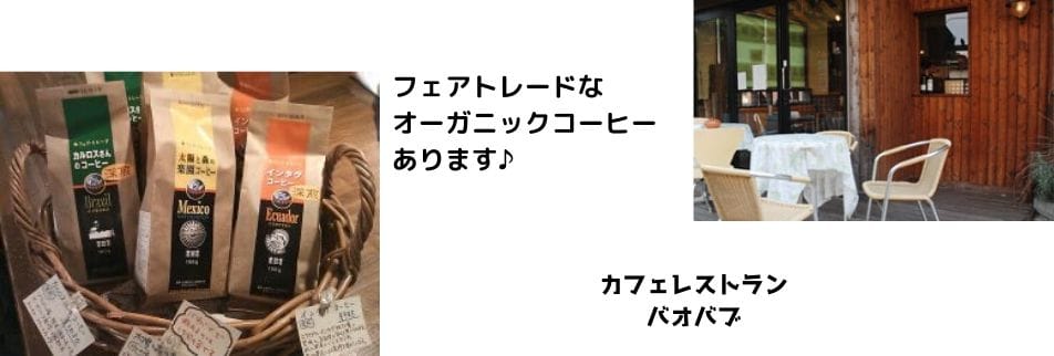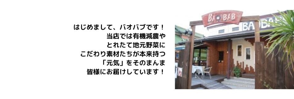 はじめまして、バオバブです!当店では有機減農や、とれたて地元野菜にこだわり素材たちが本来持つ「元気」をそのまんま皆様にお届けしています。コーヒーも生産者のみなさんが心を込めて栽培したオーガニックな豆を使用し、一杯一杯お出ししています。のんびりとしたひとときをお過ごし下さい。