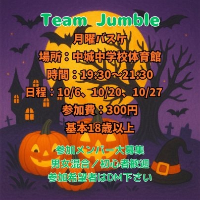 10月のバスケの開催予定は10/6(月)、10/20(月)、10/27(月)となります。参加希望者は各SNSにDMか、ページ下部にある問い合わせより連絡お願いします。