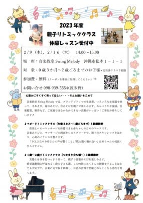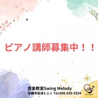 感じる心を大切に♪心豊かにすくすく育ってほしい。 沖縄県沖縄市松本にある音楽教室「Swing Melody」は、0歳からの音楽教室で、ピアノ、リトミック、フルート、英会話のコースがあります。音楽が大好きになる魅力いっぱいの教室で、心も体も豊かにリフレッシュしよう♪