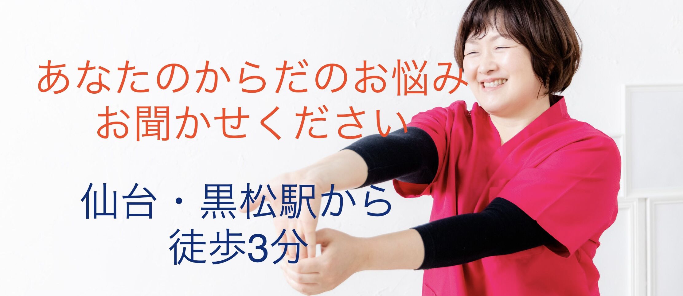 地下鉄黒松駅から徒歩3分! 仙台で女性が安心して通える整骨院 肩こり・腰痛・冷え性・頭痛・不眠でお悩みの方 些細な事もお話しませんか?
