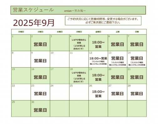 9月営業スケジュールのご案内