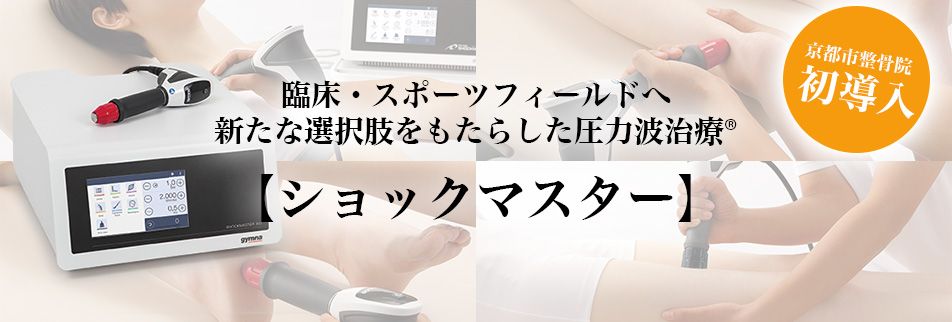 京都市右京区嵯峨広沢で五十肩や足底腱膜炎や腰痛、ひざ痛など慢性疼痛の施術を中心に施術を行っており、当院の衝撃波治療器、ショックマスターは、京都市の整骨院では初めて導入させていただき、患者様から数回の通院で痛みがなくなった、1回5分くらいの施術で肩が軽くなったとご好評いただいております。