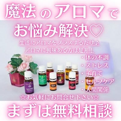 アロマに興味があり、生活に取り入れたいけど、何から始めたらいいのかよく分からない・・・という方や体の不調や精神的な悩み、子育ての悩みなどに困っている方にオススメの無料相談チケットです。あなたのお悩みを聞いてオススメのアロマや様々な提案を提供させていただきます♪