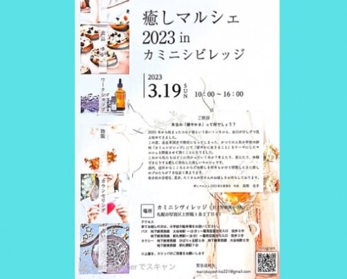 3/19札幌市厚別区にあるカミニシヴィレッジ(旧上野幌西小学校)にて癒しマルシェが開催されます。マッサージなどの施術系や地球と体にやさしい食品、物販、それから占い、カウンセリングなど約70店舗が出店します。