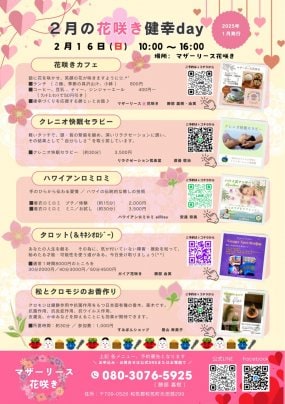 2月16日の花咲き健幸Dayにはベテランのヒーラーさんやワーカーさんがあなたをお待ちしています。