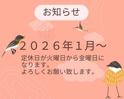 2026年1月〜 定休日が火曜日→金曜日 へと変更になります。