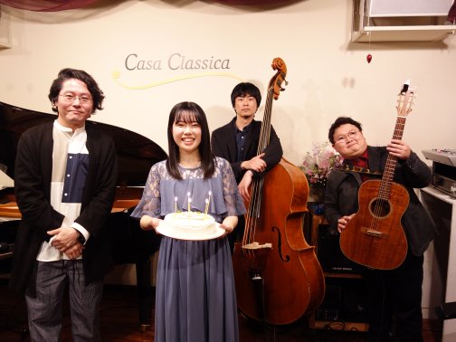 梨菜さん(ピアノ弾き語り・ボーカル)村上聡さん(ピアノ)細野慎平さん(コントラバス)おにぎり関根さん(アコースティックギター)オリジナル曲を中心にアコースティックな心地よいサウンドをお届けくださった2ステージ。アルバムのレコーディングにも参加されたサポートメンバーが梨菜さんのピュアな歌声に力強いハーモニーを添えてくださいました。お客さまからのバースデーケーキのプレゼントやあたたかい掛け声で、梨奈さんにとっても思い出のライブとなったのではないでしょうか。今回も素敵な演奏をありがとうございました! …続きを読む