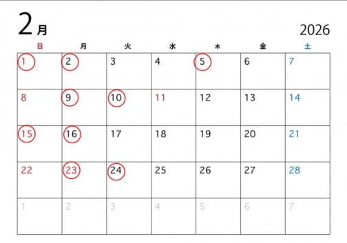 5日.6日.13日.14日.19日.20日.29日.30日の🔴は定休日になります。