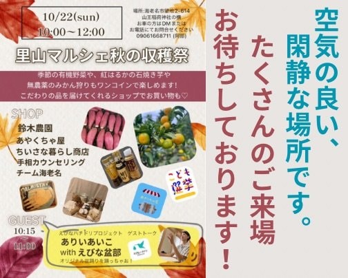 海老名市望地の鈴木農園さんは農薬を使わない農法でお野菜やフルーツを生産されています。日曜日恒例の里山マルシェに、あやくちゃ屋も出店いたします。秋の収穫祭‼️旬のさつまいもや、500円でミカン狩りもできるそうです。ぜひお子様とお越しください。