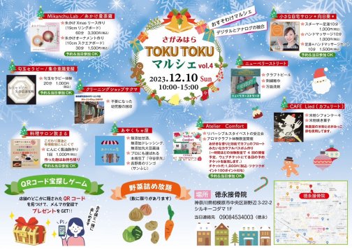 相模原市淵野辺の徳永接骨院さんでは、休診日である日曜日に医院を開放したマルシェを開催されています。2022年12月よりスタートした本試みは、今回で4回目となります。あやくちゃ屋も12/10(日)10:00-15:00で出店し、イベントを盛り上げます。宝探しのように院内の二次元バーコードをさがしてスマホで読み込み、メルマガ登録をすればその場で嬉しいプレゼントが沢山もらえます!ぜひこの機会をご利用ください。 …続きを読む