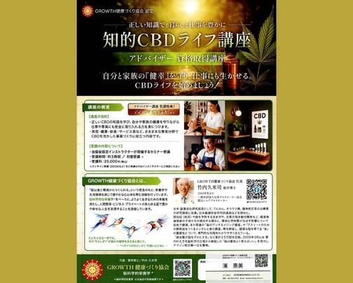薬学博士の竹内久米司先生が代表を務めるGROWTH健康つくり協会の知的CBDライフアドバイザー講座を開催します。