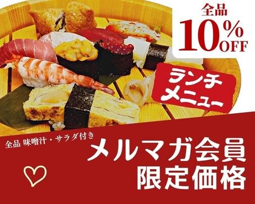 ◆【今だけキャンペーン】開催中! ◆🎉メルマガ会員初回登録で「生ビール1杯またはソフトドリンクプレゼント!」🎉旬のお寿司情報・イベント・お得情報などメルマガにてご案内させて頂きます。メルマガを読んでくださった方限定プレゼントも♪✨