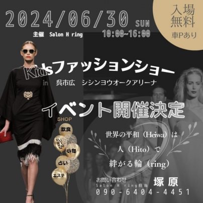 呉を盛り上げたいという想いから、地元呉市で開業15年目を迎える弊社「Salon H ring」がキッズファッションショーを厳選した約20店舗の出店者様と共にイベントを開催します。 …続きを読む