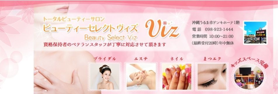 vizドン・キホーテうるま店は、まつ毛エクステ、まつ毛パーマ、ジェルネイル、美肌脱毛、フェイシャル等女性の綺麗を全面的にサポート致します!美容師免許保持スタッフが丁寧に対応致します!!