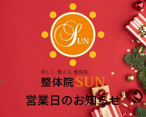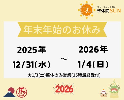 年末年始について・12月31日(水)〜2026年1月4日(日)までお休みになります!1月3日(土)に『整体のみ』営業となります。最終受付15時となってます。お休み期間中はLINE、InstagramのDMにてご連絡が可能です。お気軽にご連絡ください。良いお年をお迎えください(^ ^) …続きを読む