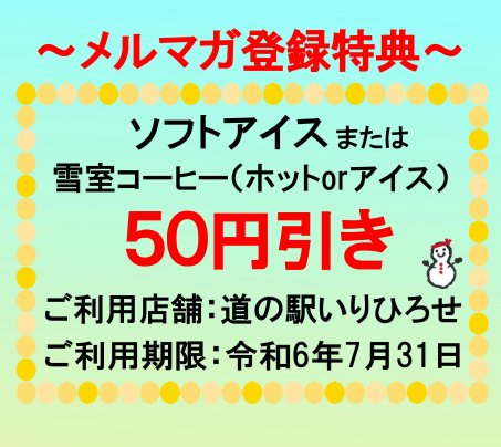 今当店のメルマガにご登録いただいた方に、道の駅いりひろせの店頭で使えるクーポンを差し上げます。