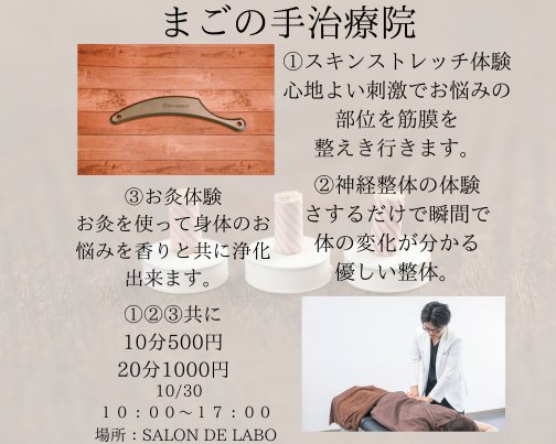 10月30日(日)10時〜17時に紋別市Salon de Laboさんでのイベント【サロンで過すおとなの休日】に出店します。当院はスキンストレッチ、神経整体、お灸体験できます。当日メルマガ登録でメルマガ特典・アプリお気に入り特典で耳ツボ2ヶ所施術orセルフケア動画プレゼント!オホーツクの海が見える素敵なカフェが会場です。他にも魅力的な出店がいっぱい。マヤ暦、お灸、アクセサリー、足圧マッサージ、イトオテルミー、ハーブワークショップ、特製ドライカレー、スイーツなどなど、お楽しみに♪ …続きを読む
