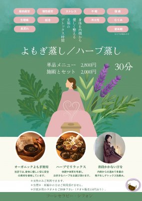 是非、施術とセットでよもぎ蒸し/ハーブ蒸しをご利用下さいませ。