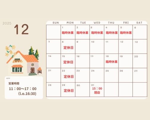 12月の営業予定です。変更がある場合は店頭、SNSにてお知らせいたします。 …続きを読む