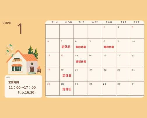 2026年1月の営業予定です。変更のある場合は店頭、SNSにてお知らせいたします。 …続きを読む