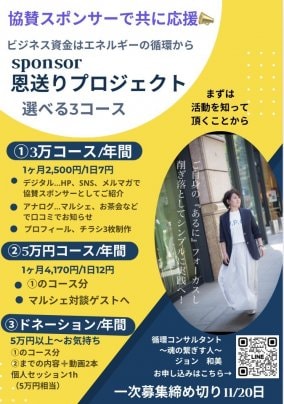 ③ご自身のスポンサーを募集し、事業資金などへのサポートになる仕組みを1時間セッションにてお伝えしていきます。 …続きを読む