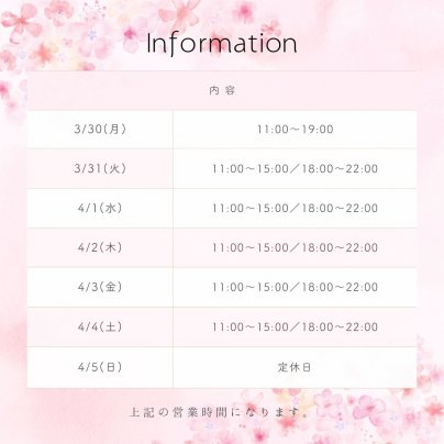 3月30日⁽月⁾〜4月5日⁽日⁾までの営業時間をお知らせします。