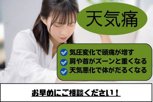 低気圧や気圧変化で頭痛・首こり・だるさが悪化する天気痛(気象病)。寒い季節は血流低下と自律神経の乱れで症状が強まりやすく、温活が重要です。