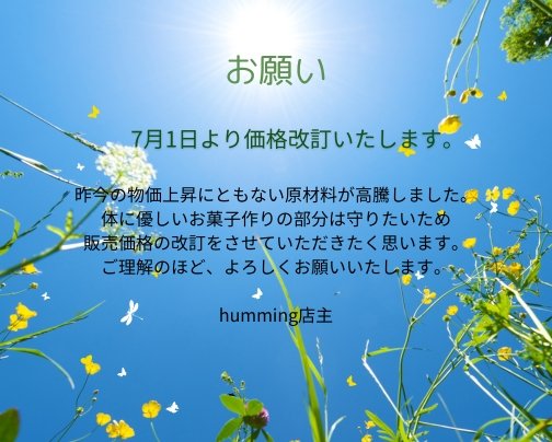 物価上昇が続く中、当店の商品の原材料も価格が高騰してきました。お客様には大変申し訳ないおもいですが、ごめんなさい。価格を上げさせて下さい。これからも喜んでいただけるようなお菓子作りを精進して参ります。よろしくお願いいたします。 …続きを読む