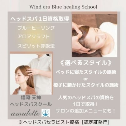 福岡ヘッドスパスクール&サロン|スクール講座メニューセラピスト1day基礎コース·セラピスト2days基礎コース|セラピスト基礎3daysコース|サロンメニュー頭の休息ウインドイーラヘッドスパ•ブルーヒーリング施術60分・90分