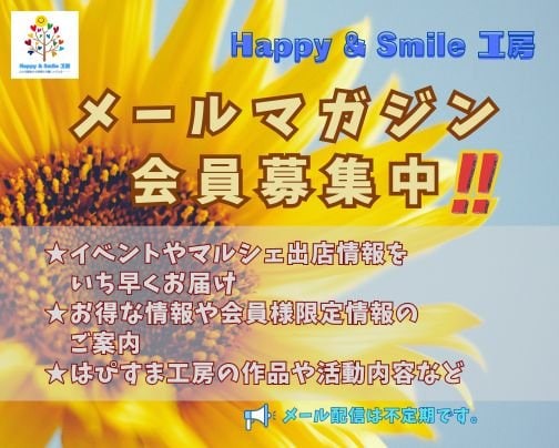 「Happy & Smile 工房」では、これから楽しい催しを企画しております。イベントやマルシェ出店情報、メルマガ会員限定情報もご案内させて頂きます。是非この機会にご登録をお願い致します。