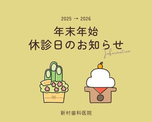 今年も、新村歯科医院へ来院いただき ありがとうございました。年末年始の休業日は、12月28日(日)より新年1月4日(日)までといたします。