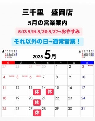 通常の定休日(5月13日)に加え、誠に勝手ながら5月14日(水)も臨時休業とさせていただきます。