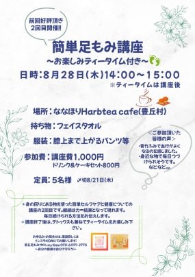 豊丘村の”ななほり Harbtea cafe”にて第2弾の簡単足もみセルフケアの講座を行う予定です。