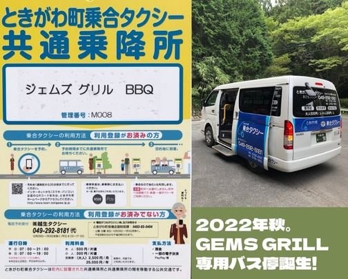ときがわ町の乗合バス(デマンドタクシー)のバス停がGEMS GRILLに設置されました!公共機関でお越しのお客様は、JR八高線の明覚駅からお越し頂けます!